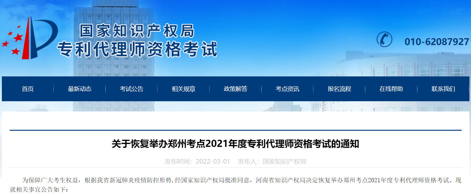 近期,多地發(fā)布關于恢復舉辦2021年度全國專利代理師資格考試的通知。廣州、鄭州、杭州、重慶、西安考點將于2022年3月26日至27日恢復舉辦2021年度全國專利代理師資格考試。