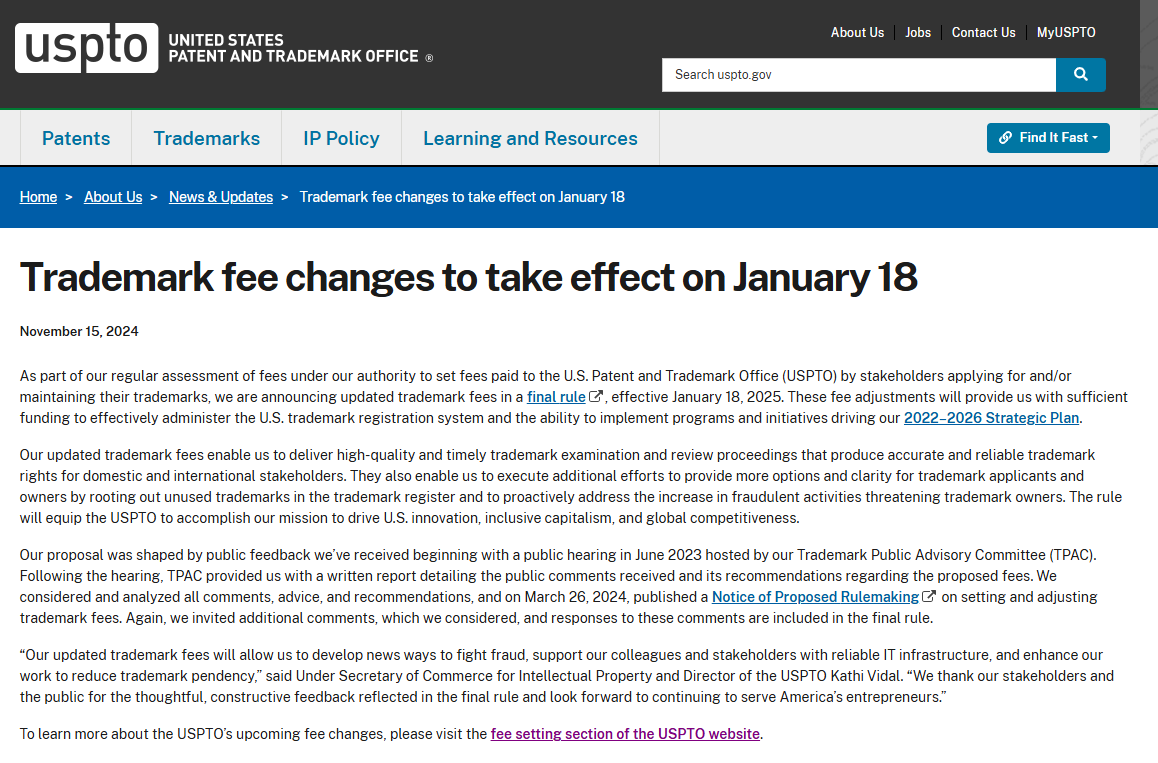 官宣!2025年1月18日起美國商標(biāo)費用正式上調(diào)