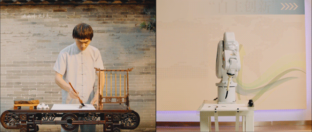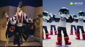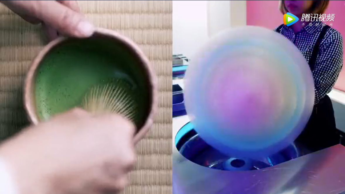 如:在杭州視頻中的中國傳統(tǒng)戲曲與智能機(jī)器人共舞,而在東京視頻中則存在木偶戲與智能機(jī)器人共舞的橋段;杭州視頻中的綠茶和咖啡的對比,而在東京視頻中則存在抹茶和棉花糖的對比;杭州視頻中的傳統(tǒng)書法與通過智能機(jī)器人書寫書法,在東京視頻中同樣有這一表達(dá)。