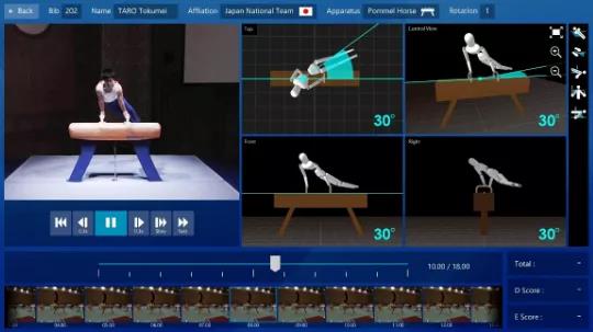 圖像可視化顯示通過3D感測測量的體操者表演者的骨骼運(yùn)動和位置,并且顯示裁判員根據(jù)體操得分規(guī)則進(jìn)行評分所需的信息。記錄體操和其他運(yùn)動的一系列縮略圖按時間順序被顯示在由實(shí)線表示的下部行中的多個小框中,從縮略圖中選擇的圖像也由實(shí)線表示在左上方的大框中。從平面,正面,側(cè)面和裁判要檢查的角度捕獲的圖像被顯示在右上角的四個中間框架中,并且在四個中間框架中的每個框架中,還顯示有根據(jù)計(jì)分規(guī)則進(jìn)行計(jì)分的信息。