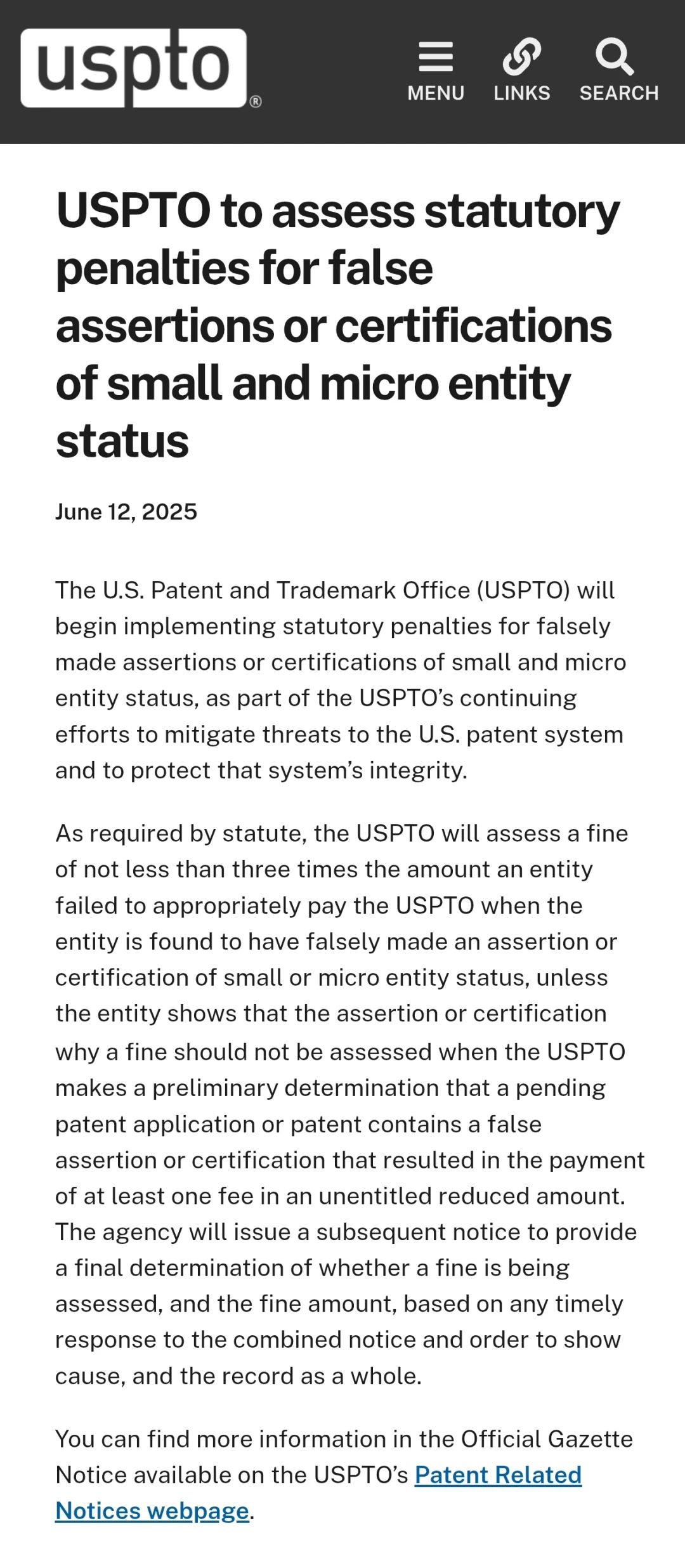 2025年6月12日,美國專利商標(biāo)局(USPTO)宣布將開始實施對小微實體虛假聲明或認(rèn)證的法定處罰。此舉旨在維護(hù)美國專利體系的完整性與公平性,減少對體系的潛在威脅。該處罰措施已于2025年6月12日起生效實施。相關(guān)申請人務(wù)必重視此項新規(guī),確保自身申報的實體狀態(tài)真實準(zhǔn)確,避免面臨嚴(yán)厲處罰。